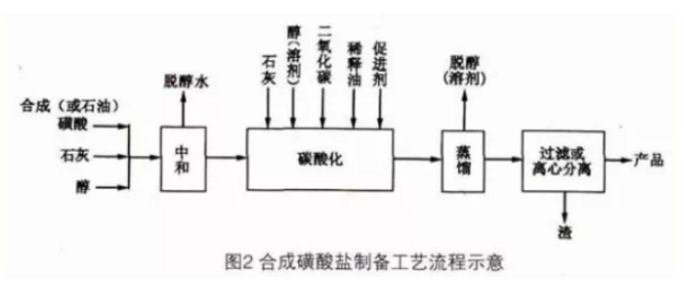 按合成途徑分,以潤滑油餾分作為原料生產(chǎn)的磺酸鹽為石油磺酸鹽;而以各種合成烷基苯為原料生產(chǎn)的磺酸鹽為合成磺酸鹽。石油磺酸鹽是以相對分子質(zhì)量為380的潤滑油餾分為原料。合成磺酸鹽的制備(以鈣鹽為例)是以生產(chǎn)12-烷基苯的副產(chǎn)物重烷基苯或烯經(jīng)與苯烷基化制得的合成烷基苯為原料,然后用發(fā)煙硫酸或So3進行磺化,得到石油磺酸或合成磺酸;再用石灰與磺酸反應(yīng)(金屬化)生成中性磺酸鈣鹽;最后碳酸化,在醇類促進劑存在條件下,加入石灰并通入二氧化碳,得到中堿值或高堿值磺酸鈣鹽。合成磺酸鹽的制備工藝流程見圖2。